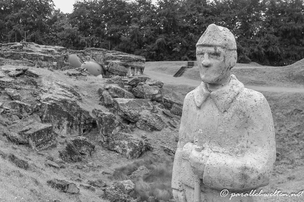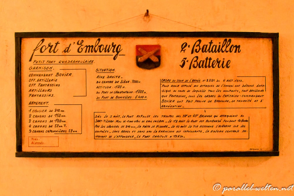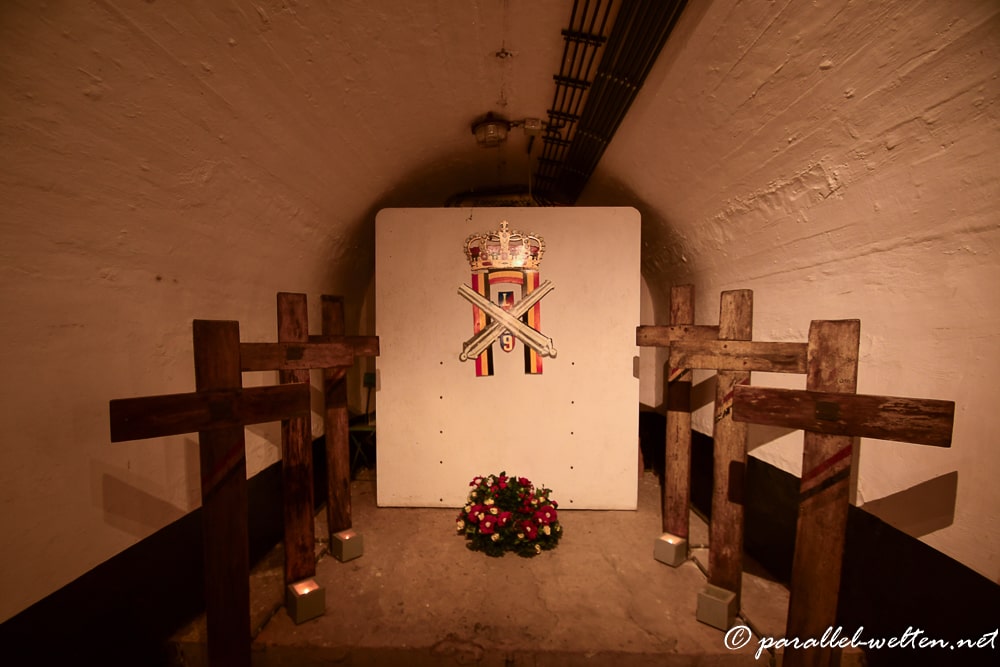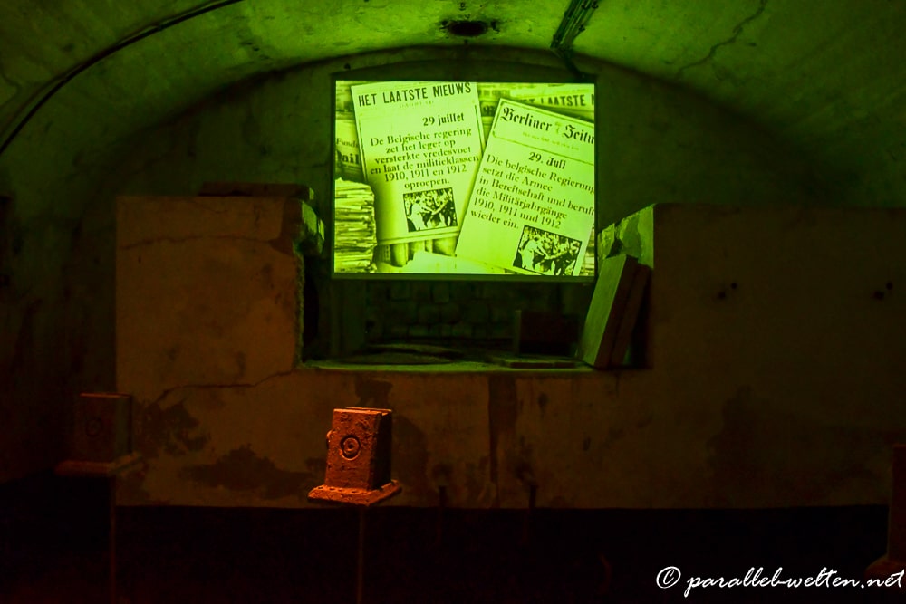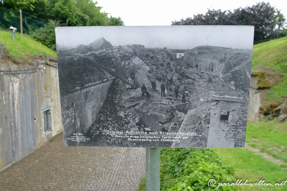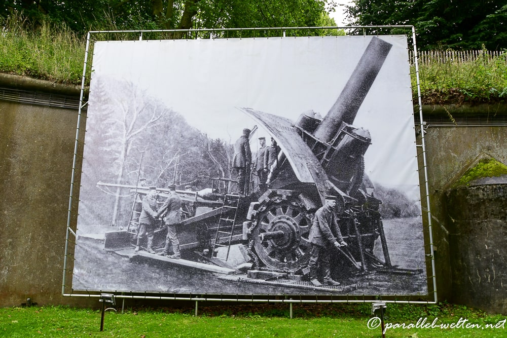 Elf Tage lieferten die Belgier erbitterten Widerstand gegen die deutsche Wehrmacht. Am 15.08.1914 wurde das Fort de Loncin, nach schwerem Beschuss, von einer 42cm-Mörser aus dem Rohr der berühmten Kanone „Dicke Bertha“ getroffen. Die Granate durchschlug den Beton des Zentralmassivs und detonierte in der rechten Pulverkammer. Durch die Explosion der dort lagernden Munition wurde das Fort förmlich zerrissen und fast vollständig zerstört. Insgesamt starben bei dem Angriff 350 Soldaten – es blieb nur noch die Kapitulation. Die Überreste der Toten liegen bis heute noch unter den Trümmern der Gedenkstätte.